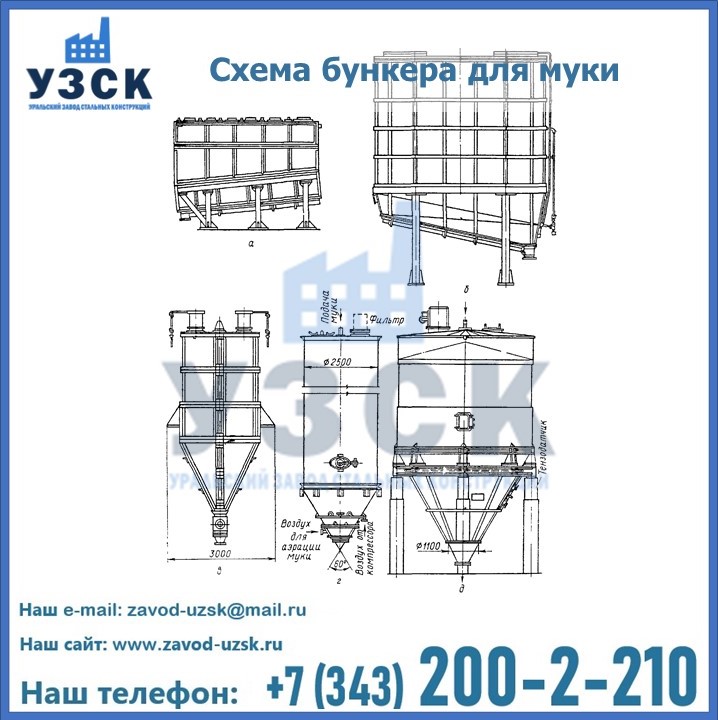Завод «УЗСК» в Златоусте осуществляет проектирование, производство и продажу бункеров для муки. Всю информацию, касающуюся производства, реализации и установки емкостного оборудования можно узнать на нашем сайте или по телефонам, указанным в разделе «КОНТАКТЫ».