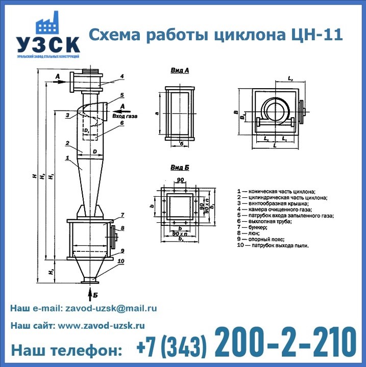 При этом ощутимой разницы в цене между универсальным и узконаправленным, подобранным в соответствии с конкретными техническими требованиями циклоном, нет. Стоимость воздухоочистительного оборудования типа циклон обусловлена маркой и толщиной стали, из которого он изготовлен, сложностью и специфичностью конструкции, наличием дополнительного оснащения (бункер, улитка и другие). При необходимости, на заводе УЗСК в Златоусте будет изготовлен циклон по индивидуальным техническим чертежам заказчика.