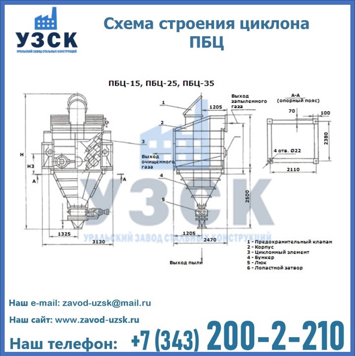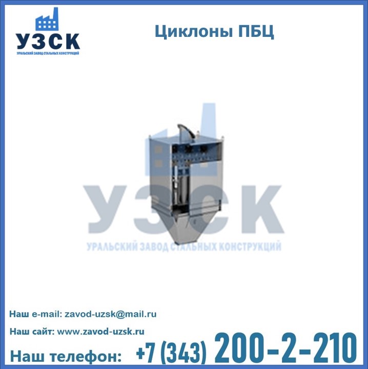 Завод «УЗСК» в Златоусте предлагает приобрести циклоны ПБЦ и прочие устройства, полностью укомплектованные и готовые к эксплуатации. Мы гарантируем соответствие оборудования всем требованиям ГОСТ и ТУ, износостойкость и высокую производительность предлагаемого оборудования. Уральский Завод Стальных Конструкций изготавливает и продает надежное, эффективное и производительное оборудование, имеющее длительную гарантию и большой эксплуатационный ресурс. Если требуется изготовить циклон нестандартных размеров, то такой вариант выполнения заказа тоже предусмотрен, так как предприятие имеет собственные производственные площади и надежных поставщиков. На все поставляемое или производимое оборудование имеются чертежи и прочая техническая документация. Заказать и купить циклоны или прочее оборудование высокого качества и по доступной цене можно через наш сайт или по указанному в разделе «Контакты» телефону.