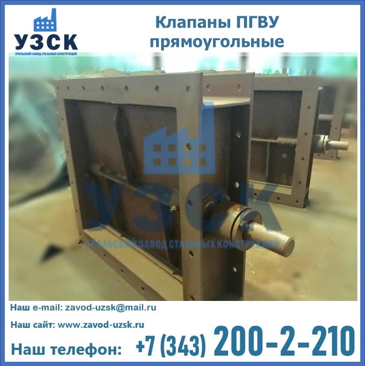 Прямоугольный клапан ПГВУ имеет прямоугольную или квадратную форму, по основному сечению конструкции, на которую устанавливается клапан. Для изготовления шиберов ПГВУ в Златоусте применяются сталь нержавеющая, углеродистая или низколегированная, в зависимости от модели. Внутри клапана имеется запорный элемент, передвигающийся параллельно общему потоку движения среды. Запорный элемент, или створка имеет такую же форму, как и основное сечение. Перемещение створки происходит благодаря возвратно-поступательным движениям.