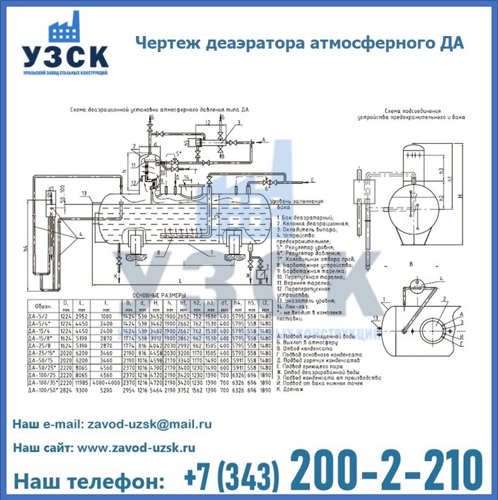 Приобрести качественное оборудование, в том числе, деаэраторы ДА, можно в компании УЗСК в Златоусте. Мы предлагаем долговечную и надежную продукцию по приемлемой цене. Заказать и купить деаэраторы или другие изделия высокого качества можно через сайт Уральского Завода Стальных Конструкций, или позвонив по указанному в разделе «Контакты» телефону.